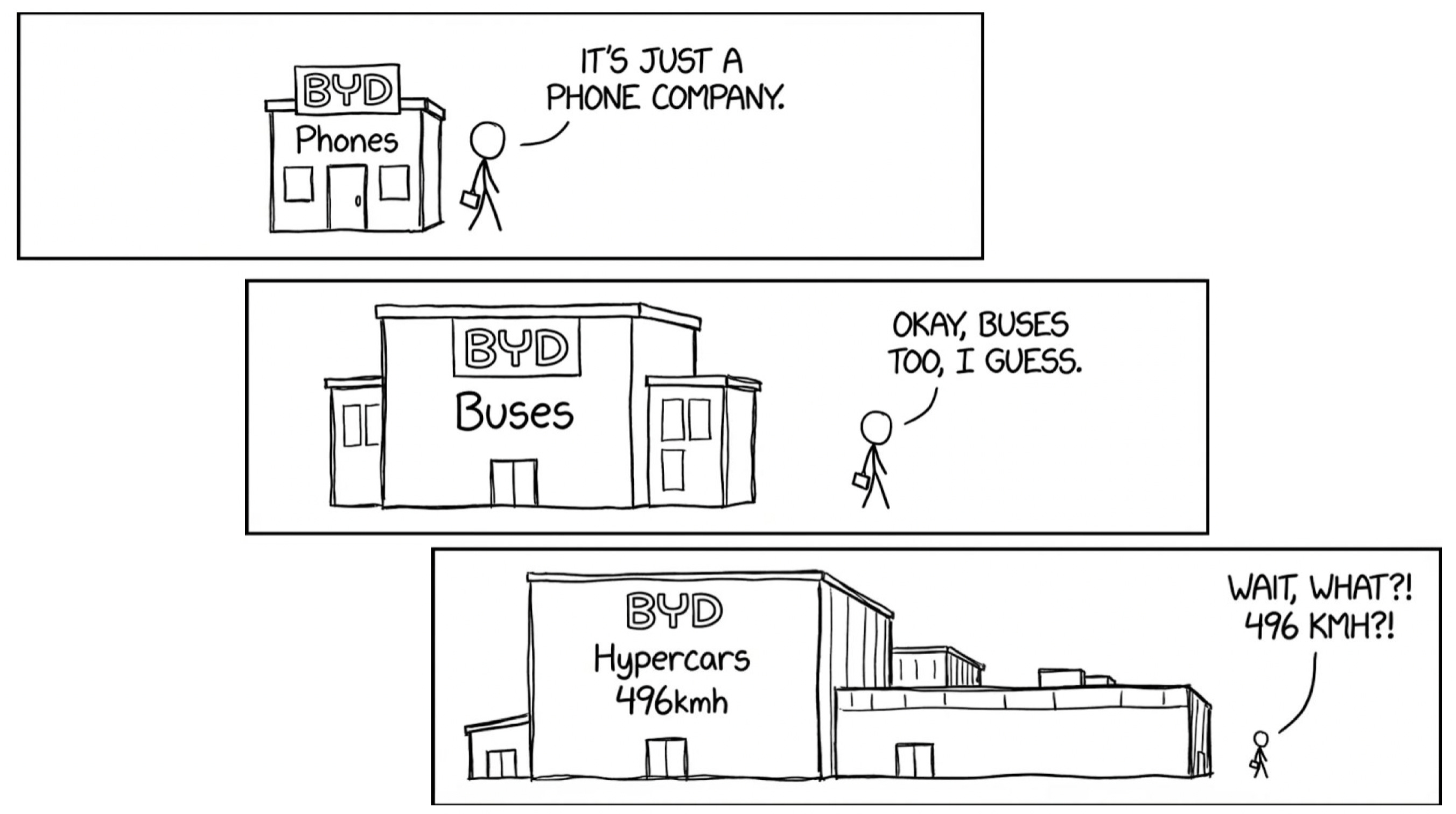 BYD did not decide one morning to build the fastest car on Earth. First, it built phone batteries. Then E-bike packs. Bus systems. Delivery vans. Passenger cars. Hypercars. Each rung taught something the previous rung could not. There was no quantum leap. Only the next rung.