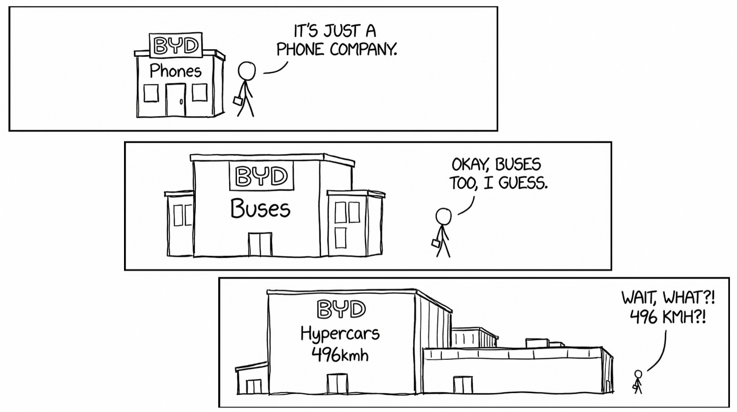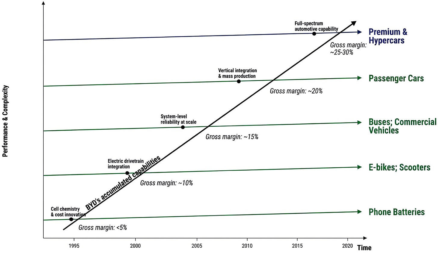 BYD didn’t climb one ladder in one market. It built a new ladder, rung by rung, across multiple industries. And each rung was invisible to the people it would eventually surpass.