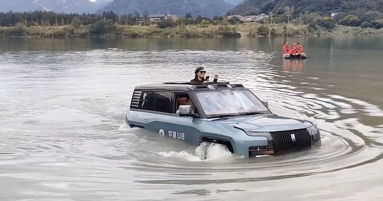 The Yangwang U8 is an SUV the size of a Land Rover. When its sensors detect water rising past the door sills, the vehicle seals itself. Air suspension rises to maximum height. The drivetrain switches modes.