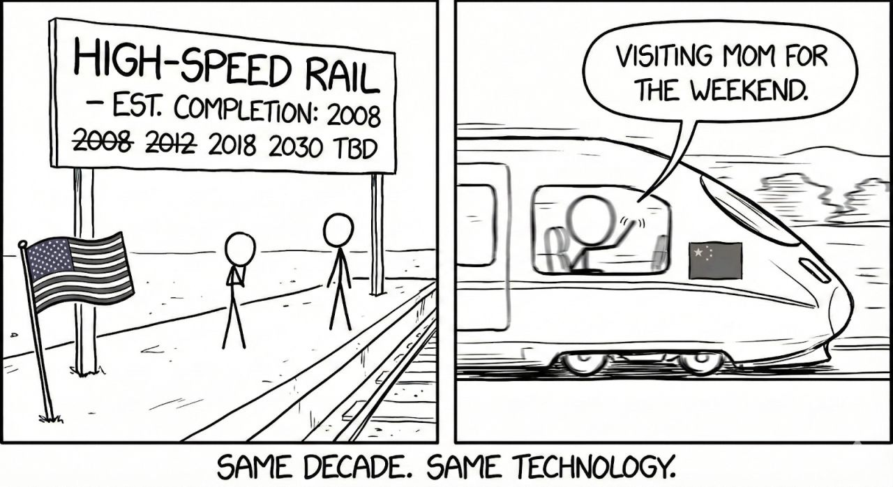 Sixteen years later, California’s train is still trapped in lawsuits and environmental reviews. Not a single passenger has boarded. China’s line was finished in three years. Today, it moves millions of people a day at 217 mph between the nation’s two biggest cities.
