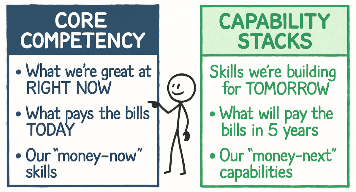 Remember Kodak? Blockbuster? They were MASTERS of their core competency. They just forgot to build new capability stacks.